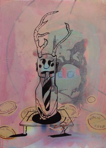 Imagines Agentes There is no Escape >>> Der Spion, 2025, Mischtechnik auf Papier, 24,5 cm x 16 cm New Age Tipi >>> Neuro-Enhancement, 2018,Mischtechnik auf Papier, 34,8 cm x 24,5 cm